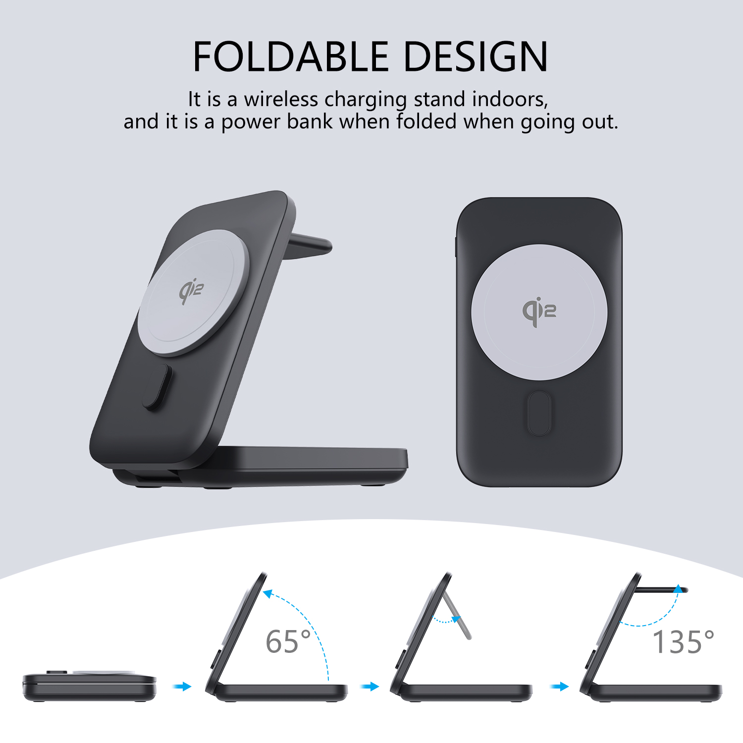 3.Foldable design, easy to carry for home office, can be adjusted to the right angle for wireless charging.